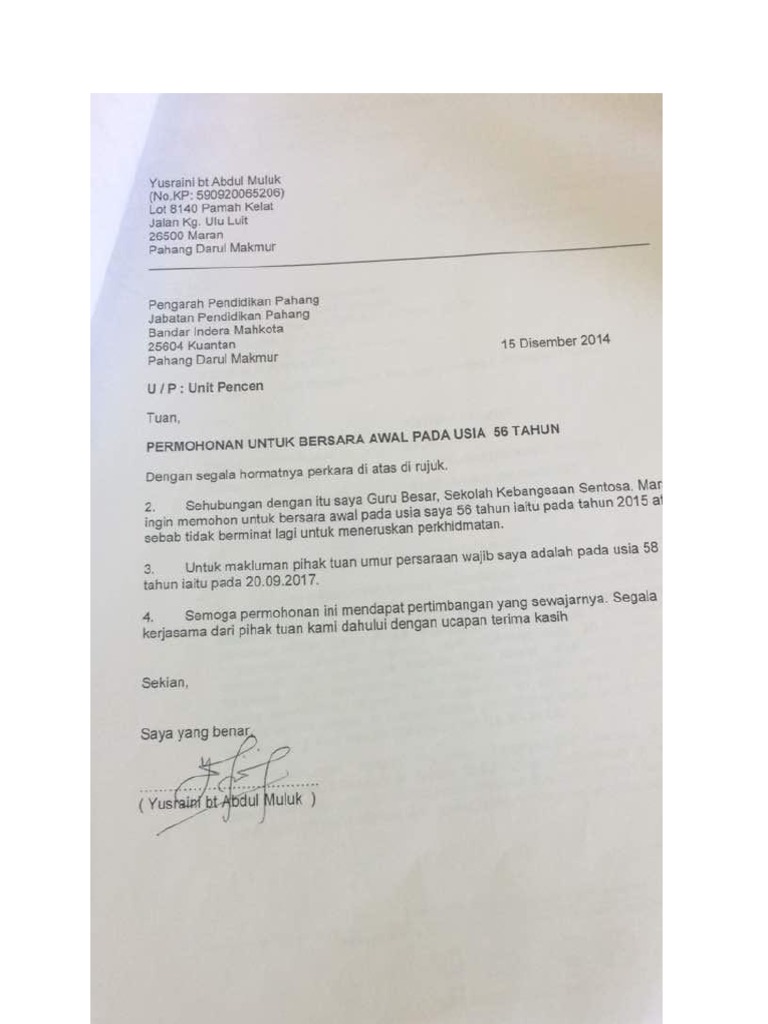 Http Www Psd Gov Bn Shared 20documents Peperiksaan Peraturan Peraturan 20am 202017 Jpa 20 20update Pdf from Ramai yang beranggapan mereka terpaksa mencapai umur opsyen berkenaan untuk bersara bagi mendapatkan faedah. Jasa catering produk makanan dan jasa konveksi. Ada bersara lebih awal atau bersara lebih lewat dari tarikh yang dipanjangkan oleh jabatan. Tuan permohonan persaraan pilihan saya memohon untuk bersara secara pilihan sendiri. Permohonan persaraan awal dengan alasan mempunyai masalah kesihatan adalah tertakluk di bawah seksyen 12 persaraan pilihan akta pencen 1980. Semua permohonan bersara pilihan sendiri hendaklah sampai di bahagian sumber manusia , kemanterian pelajaran lapan (8) bulan sebelum tarikh persaraan yang dicadangkan. (a) surat permohonan asal daripada pegawai berkenaan menyatakan sebab beliau ingin bersara dan tarikh persaraan yang dipohon; Contoh surat permohonan bersara awal download kumpulan gambar for more information and source, see on this link :
